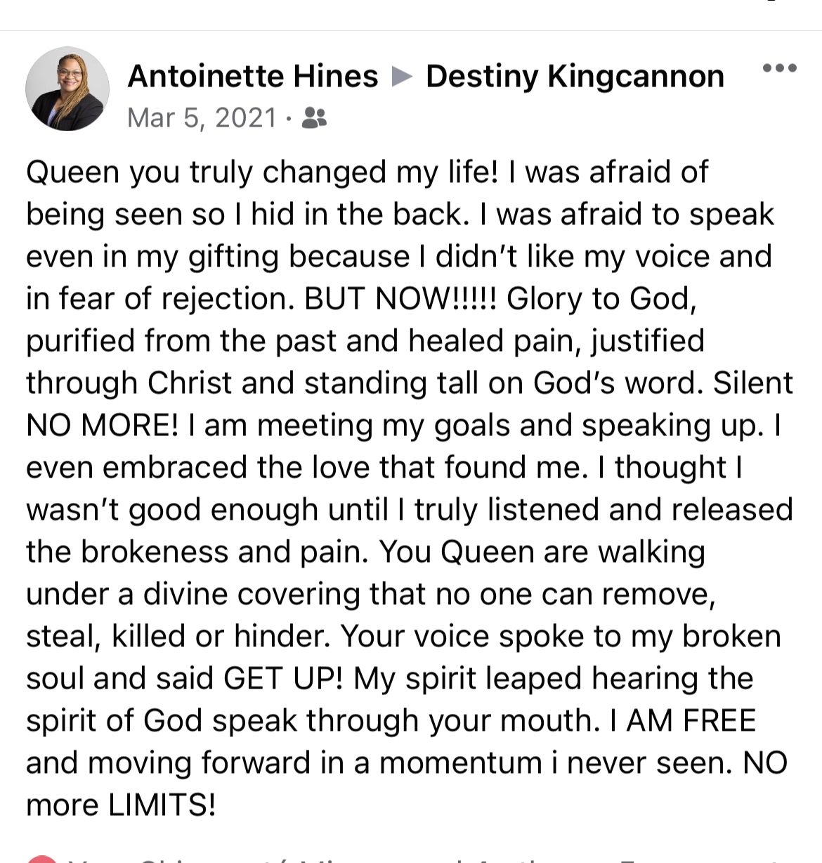 Queeeeeeen! I am a Master Certified Life & Confidence Coach, International and Award-Winning Transformational speaker, and Best Selling Author Destiny Inspire. But most importantly I am QUEEN who has conquered everything life has thrown at her from low self esteem, divorce, rejection, failure, loss of identity, people pleasing, perfection, and still came out on top!